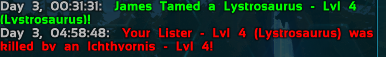 [I tamed my first dinosaur. He died several hours later. Was killed by a hostile dinosaur.]